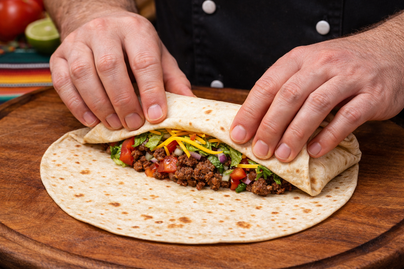 - Соберите: рис → фасоль → мясо → сыр → сальса/гуакамоле. Сверните и подсушите швом вниз.