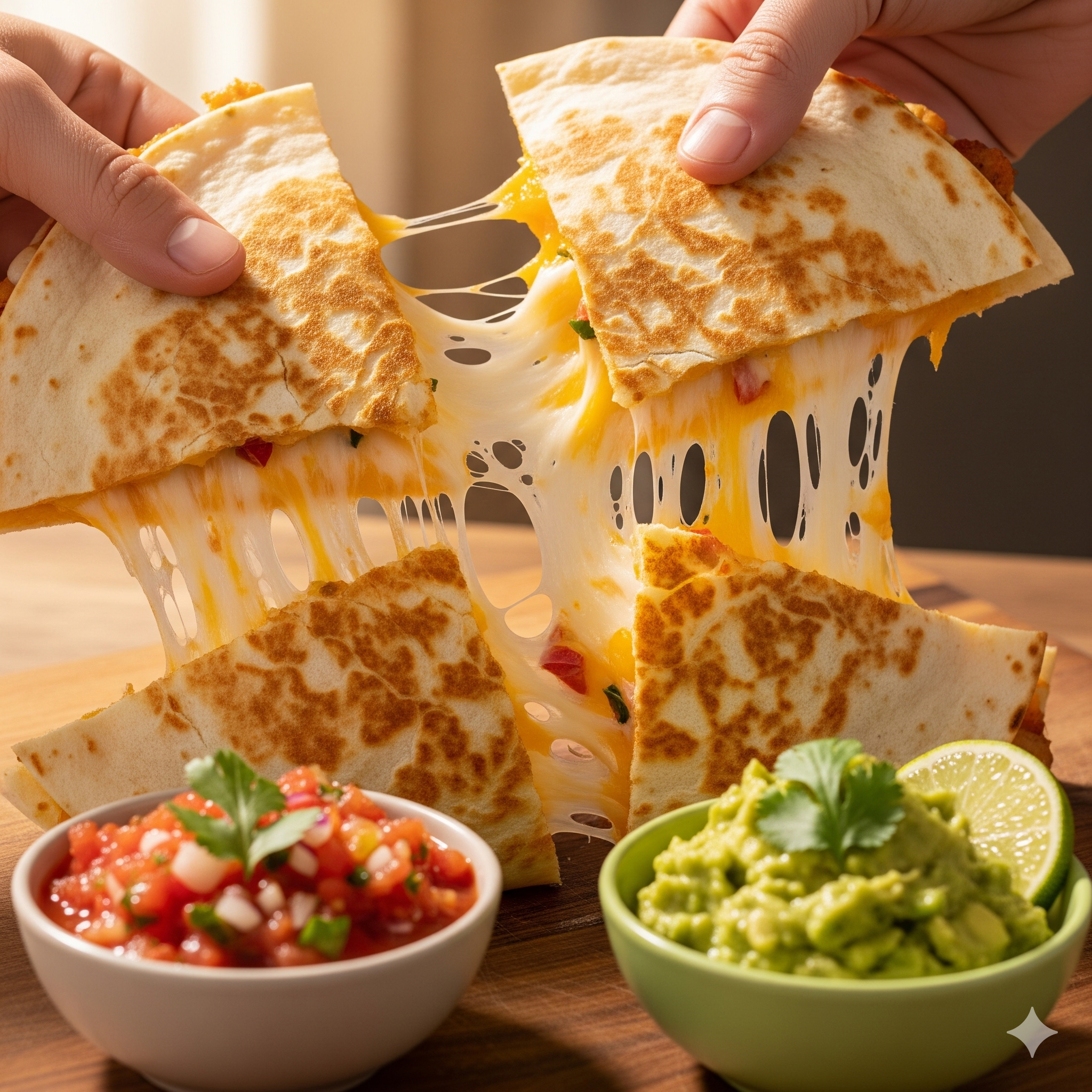 Кесадилья — тортилья с расплавленным сыром, сложенная пополам или накрытая второй тортильей. Быстро, хрустяще и бесконечно вариативно.